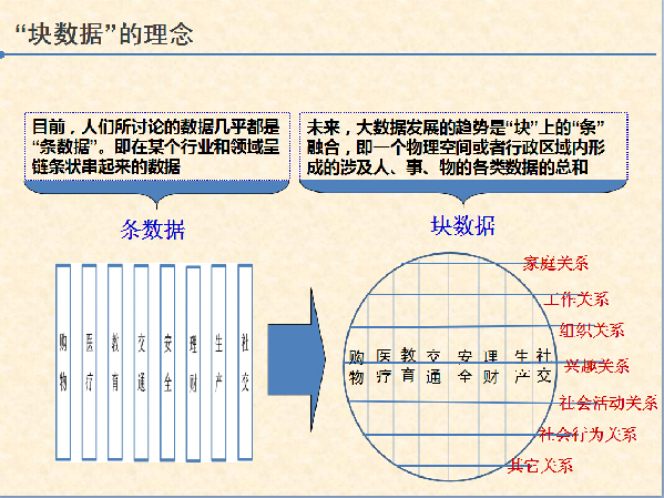 與之相比,塊數據是在一個物理空間或者行政區(qū)域形成的涉及到人、事、物等各類數據的綜合,相當于將各類“條數據”解構、交叉、融合。在塊數據集合過程中,包含了數據空間的填充、空間數據的重構、集合過程的組構,及組構過程中的集合,同時還有新數據的匯集和原有數據組合后的衍生數據。塊數據概念的提出和應用,使我們對大數據的挖掘實現了從混沌到精準。