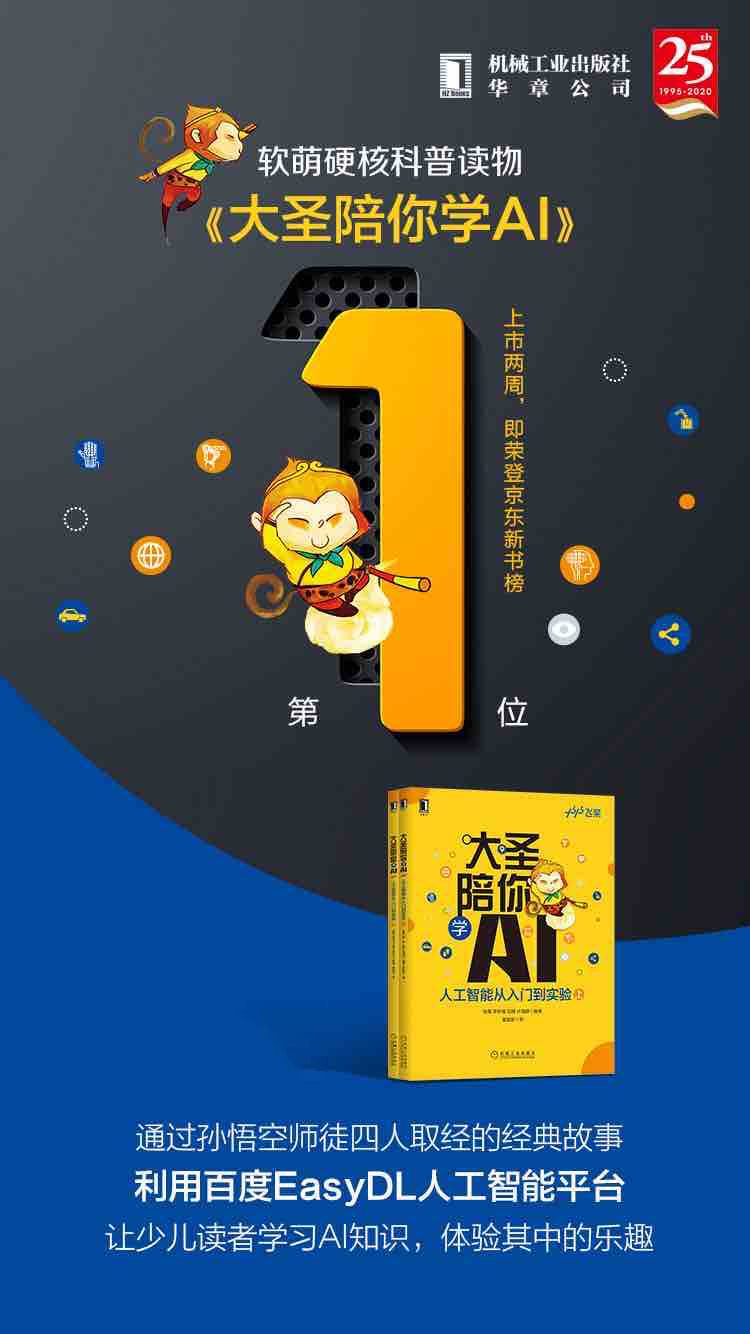 《大圣陪你學AI》一書由百度首席技術官王海峰作序、百度副總裁徐菁等編寫,并受到多位教育專家聯(lián)袂推薦。書籍一上市就脫穎而出,榮登京東計算機新書“近24小時暢銷榜”冠軍位,以軟萌硬核的故事風格俘獲了很多家長和孩子們的心,是名副其實的科普讀物“人氣王”。
