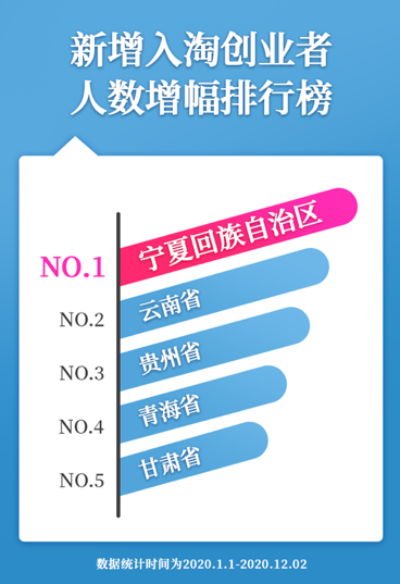 截至12月2日,今年入淘創(chuàng)業(yè)者同比增幅排名中,西部。ㄗ灾螀^(qū)、直轄市)在前10名中占據(jù)9席,且增速全部超過(guò)200%。其中,寧夏、云南、貴州、青海和甘肅位列前五。服飾、生鮮和百貨是西部淘寶商家最喜歡的三個(gè)創(chuàng)業(yè)領(lǐng)域。