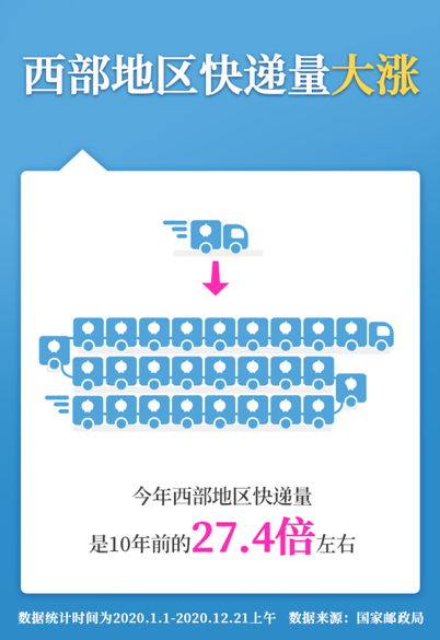 與此同時(shí),西部地區(qū)的快遞數(shù)量出現(xiàn)幾何級(jí)數(shù)增長(zhǎng)。國(guó)家郵政局?jǐn)?shù)據(jù)顯示,截至12月21日上午,今年西部地區(qū)快遞量已達(dá)到10年前的27.4倍。