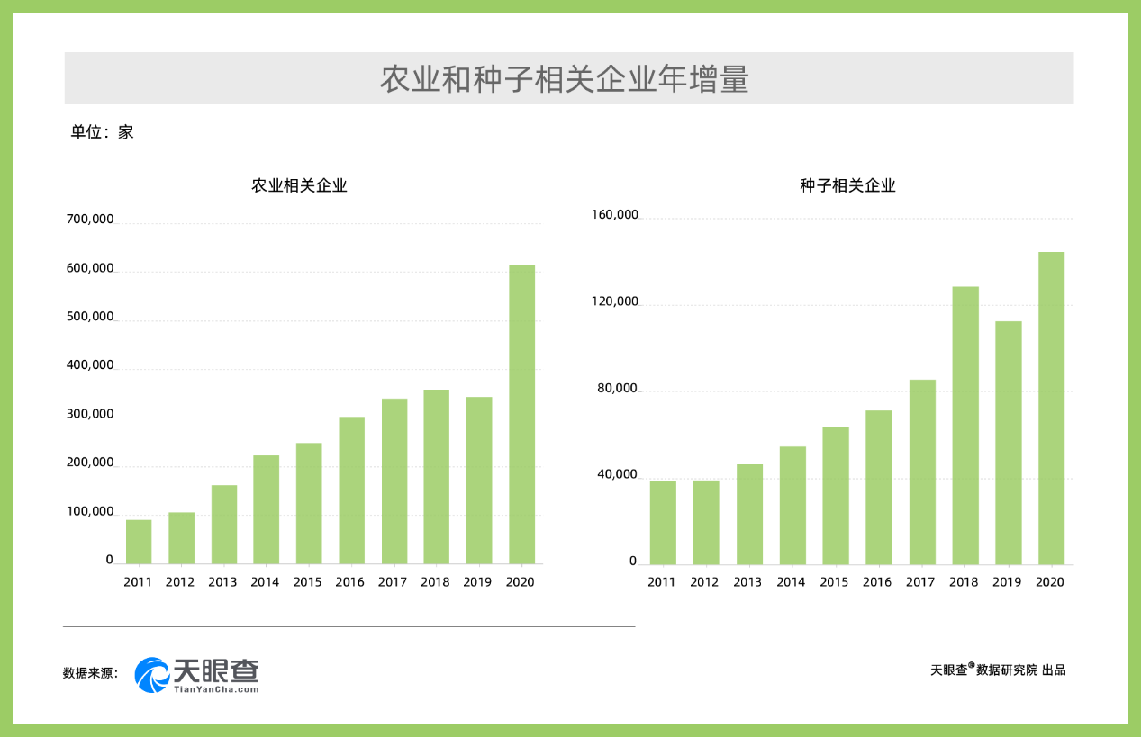 眾所周知,產(chǎn)業(yè)興旺是鄉(xiāng)村振興的重要基礎(chǔ),是解決農(nóng)村一切問題的前提。2021全國(guó)兩會(huì)召開之際,商業(yè)查詢平臺(tái)天眼查發(fā)布“鄉(xiāng)村振興”相關(guān)產(chǎn)業(yè)大數(shù)據(jù),通過研究農(nóng)業(yè)、種子、鄉(xiāng)村新型消費(fèi)產(chǎn)業(yè)的相關(guān)企業(yè)數(shù)據(jù),展現(xiàn)農(nóng)村經(jīng)濟(jì)新變化及“鄉(xiāng)村振興”發(fā)展新機(jī)遇。