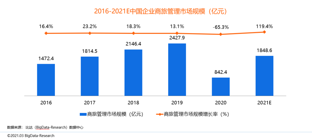 疫情對(duì)中國(guó)商旅管理市場(chǎng)影響明顯,特別是2020年,中國(guó)企業(yè)商旅管理市場(chǎng)規(guī)模下滑超65%。隨著國(guó)內(nèi)疫情基本得到有效控制,預(yù)計(jì)2021年商旅管理市場(chǎng)將大幅回暖,市場(chǎng)規(guī)模預(yù)計(jì)達(dá)1848.6億元。