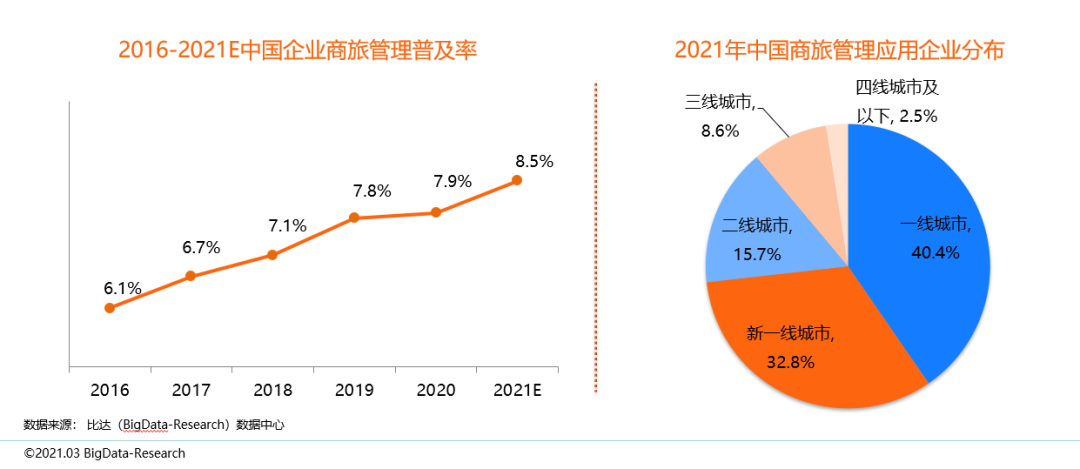 中國(guó)企業(yè)商旅管理普及率逐步攀升,受疫情影響,2020年普及率相比2019年略有增長(zhǎng),2021年隨著商旅市場(chǎng)的回暖,中國(guó)企業(yè)商旅管理普及率將提升至8.5%。另一方面,從如下數(shù)據(jù)可看到中國(guó)企業(yè)商旅管理應(yīng)用企業(yè)中73.2%分布在新一線和一線城市。