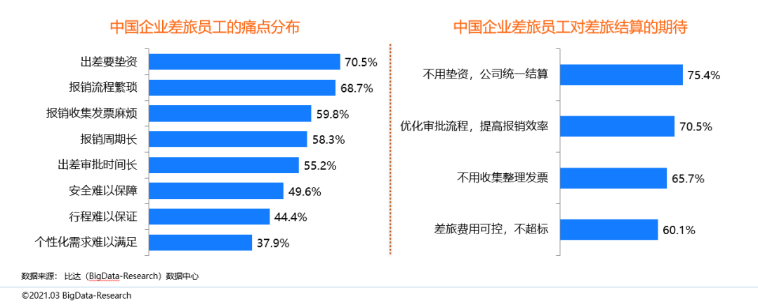 調(diào)查數(shù)據(jù)顯示,“出差要墊資”(70.5%)和“報(bào)銷流程繁瑣”(68.7%)是中國(guó)企業(yè)商旅員工的最主要的痛點(diǎn),多數(shù)差旅員工還認(rèn)為報(bào)銷收集發(fā)票麻煩、報(bào)銷周期長(zhǎng)、出差審批時(shí)間長(zhǎng)。而對(duì)差旅結(jié)算的期待方面,七成以上的差旅員工期待“不用墊資,公司統(tǒng)一結(jié)算”、“優(yōu)化審批流程,提高報(bào)銷效率”。