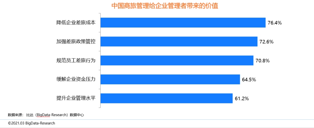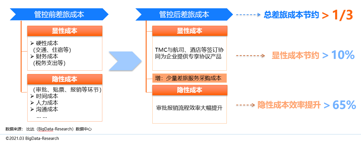 針對(duì)國(guó)內(nèi)企業(yè)的調(diào)研發(fā)現(xiàn),商旅管控后,包括交通、住宿等硬性成本和稅務(wù)等財(cái)務(wù)成本在內(nèi)的顯性成本節(jié)約超過(guò)10%。而包括審批、貼票、報(bào)銷等環(huán)節(jié)的時(shí)間成本、人力成本、溝通成本等隱性成本的流程效率大幅提升65%以上,盡管增加了少量差旅服務(wù)采購(gòu)成本,總體差旅成本節(jié)約超過(guò)三分之一。差旅成本是我國(guó)企業(yè)的第二大可控成本,企業(yè)對(duì)差旅管理的需求提升。