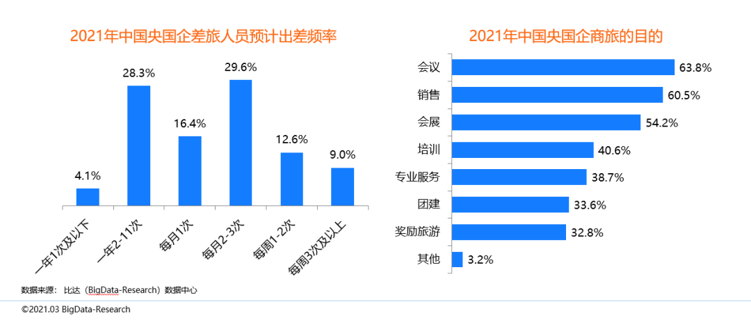 央國(guó)企差旅人員每月2-3次居多,會(huì)議為最主要目的