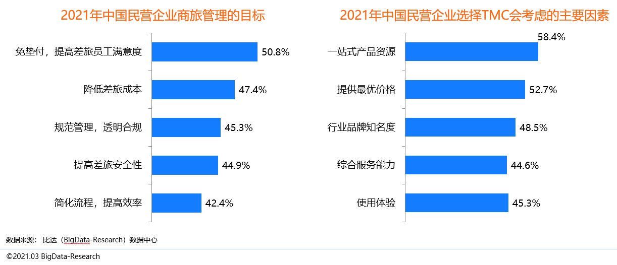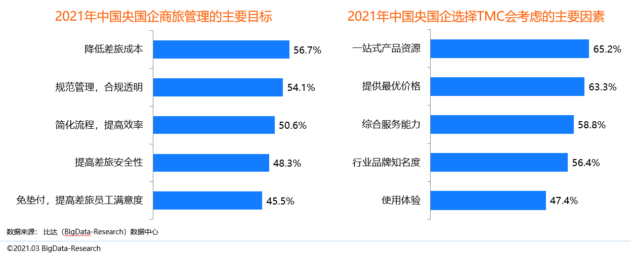 TMC商旅服務(wù)的好處在于讓企業(yè)商旅節(jié)約成本,合規(guī)透明,提高效率,安全有保障,并進(jìn)一步提高員工滿意度。受疫情影響,2021年,央國(guó)企商旅管理將降低差旅成本和提高差旅安全性作為主要目標(biāo)。同時(shí),在選取TMC時(shí)會(huì)首選考慮一站式產(chǎn)品資源,其次為提供最優(yōu)價(jià)格以及綜合服務(wù)能力。