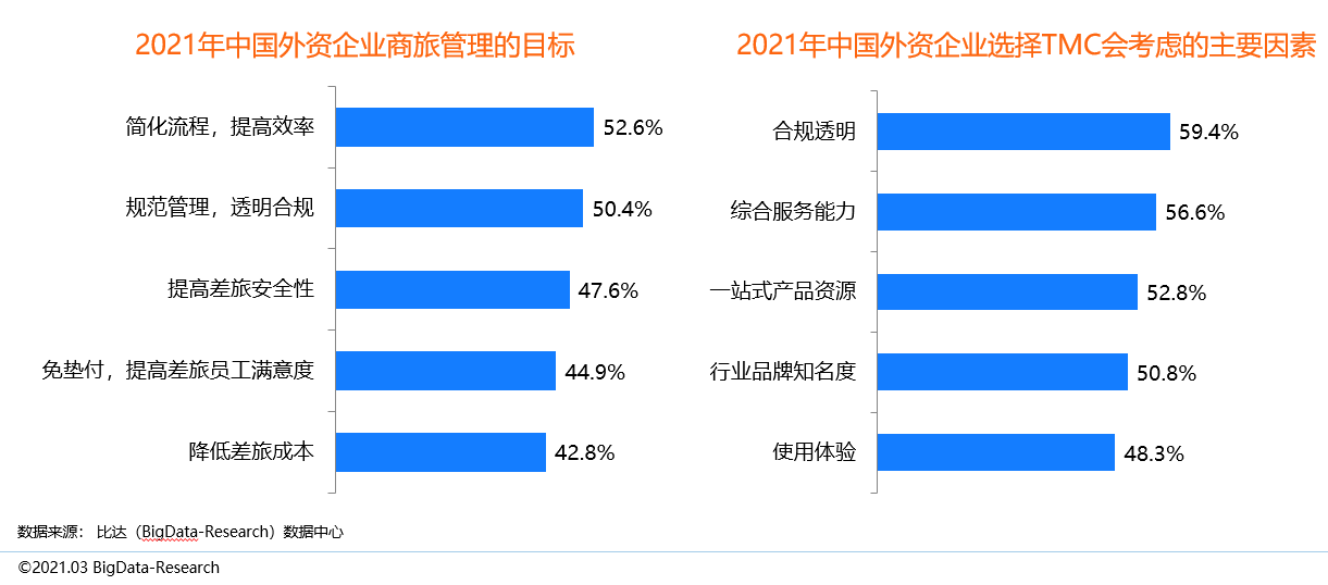 2021年,中國(guó)外資企業(yè)商旅管理的主要目標(biāo)包括:“簡(jiǎn)化流程,提高效率”以及“規(guī)范管理,透明合規(guī)”;而選擇TMC會(huì)優(yōu)先考慮“合規(guī)透明”。