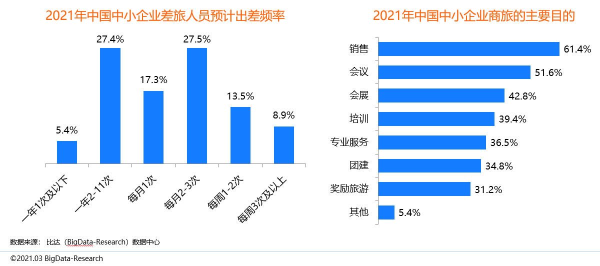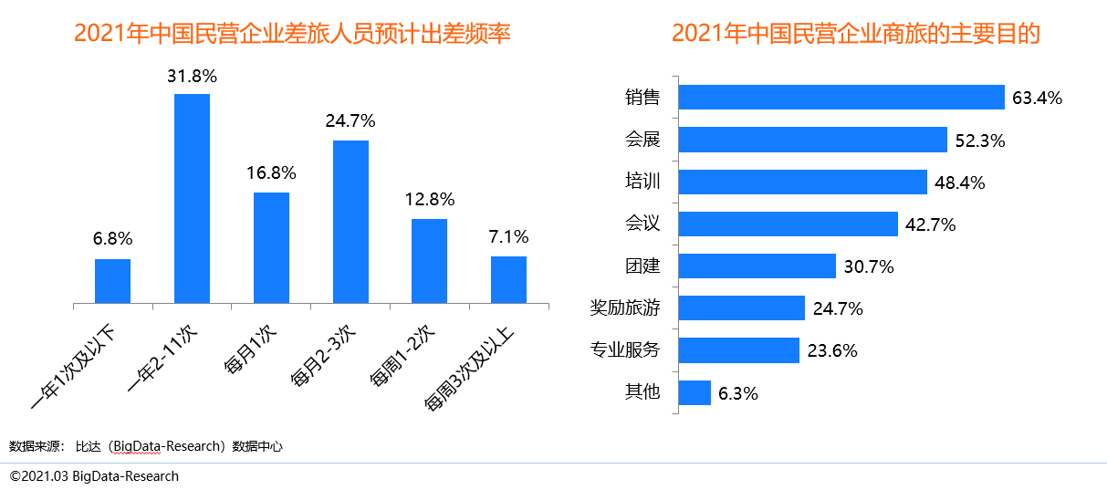 2021年出差旅人員預(yù)計(jì)一年2-11次的占比最高,達(dá)31.8%。而民營(yíng)企業(yè)商旅的主要目的第一是銷售,其次為會(huì)展、培訓(xùn)和會(huì)議。