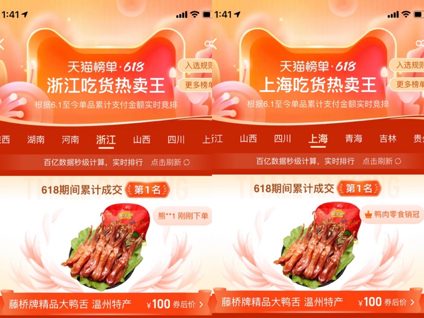 圖:鴨舌拿下浙江、上海兩地吃貨榜第一名