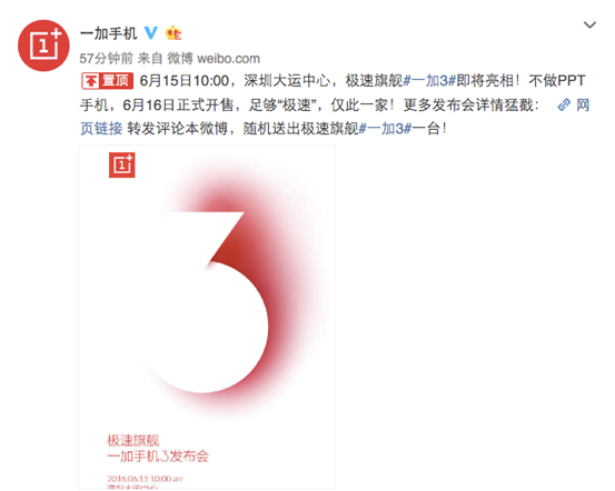 鳳凰科技訊 6月1日消息,一加手機(jī)微博正式對(duì)外公布極速旗艦一加3將于6月15日上午10點(diǎn)整在深圳大運(yùn)中心舉行發(fā)布會(huì),并將于發(fā)布會(huì)第二天6月16日正式開售。