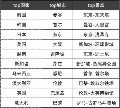 在景點(diǎn)方面,東京東京塔、曼谷大皇宮、東京淺草寺、新加坡環(huán)球影城、東京迪士尼、新加坡魚(yú)尾獅公園、首爾首爾塔、巴黎埃菲爾鐵塔、倫敦大英博物館、羅馬古羅馬斗獸場(chǎng)最受歡迎。相近的文化習(xí)俗、較低的語(yǔ)言門(mén)檻與完善的旅游服務(wù),吸引了大批中國(guó)游客選擇前往東南亞享受“黃金周”,但與此同時(shí),過(guò)去游客相對(duì)較少的小眾目的地,也以越來(lái)越強(qiáng)的姿態(tài)出現(xiàn)在長(zhǎng)線(xiàn)出境游名單中。