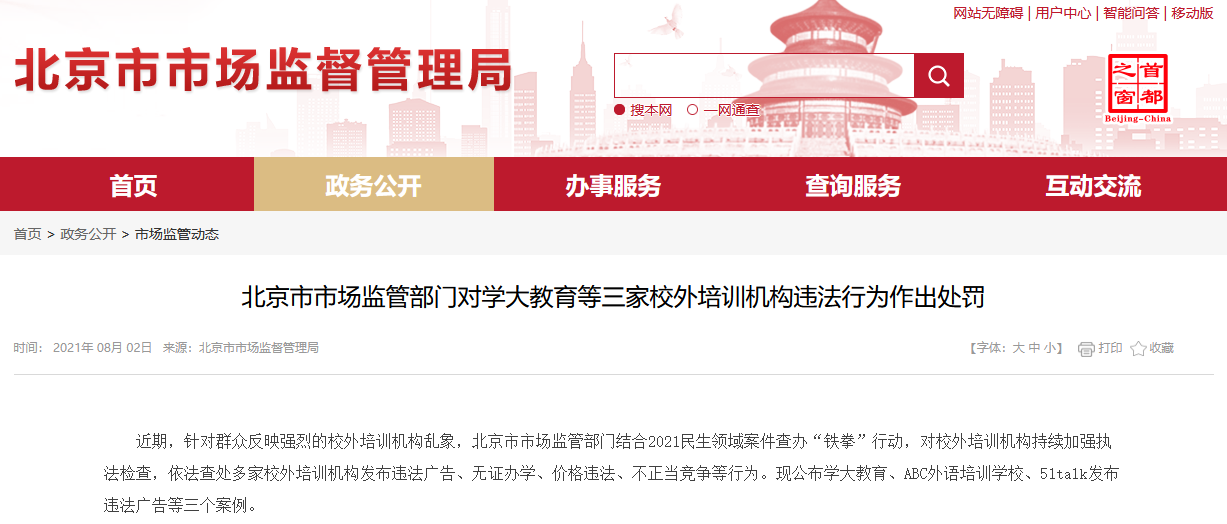北京市市場監(jiān)督管理局稱,近期,針對群眾反映強烈的校外培訓機構(gòu)亂象,北京市市場監(jiān)管部門結(jié)合2021民生領(lǐng)域案件查辦“鐵拳”行動,對校外培訓機構(gòu)持續(xù)加強執(zhí)法檢查,依法查處多家校外培訓機構(gòu)發(fā)布違法廣告、無證辦學、價格違法、不正當競爭等行為。現(xiàn)公布學大教育、ABC外語培訓學校、51talk發(fā)布違法廣告等三個案例。