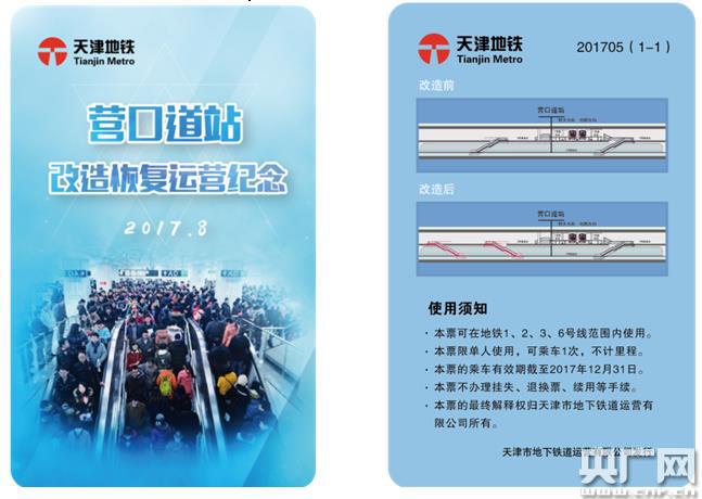 為感謝廣大乘客對(duì)營(yíng)口道站改造的大力支持,天津地鐵運(yùn)營(yíng)公司將于8月16日同步限量發(fā)行2000套“營(yíng)口道站改造恢復(fù)運(yùn)營(yíng)”主題紀(jì)念票。紀(jì)念票含地鐵乘次票一枚,持該票可在地鐵1、2、3、6號(hào)線范圍內(nèi)乘車1次,不計(jì)里程,有效期截至2017年12月31日。該紀(jì)念票售價(jià)為20元/套,可在營(yíng)口道、天津站、西南角、長(zhǎng)虹公園、紅旗南路、西站、北站的客服中心購(gòu)買,每人限購(gòu)5套。