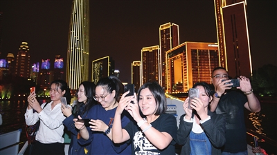 隨著游船緩緩駛出碼頭,大家趕緊拿出手機(jī)、相機(jī),選好角度,架起“長(zhǎng)槍短炮”,時(shí)刻準(zhǔn)備著定格最美瞬間,生怕錯(cuò)過任何一處景致。的確,記者在船中也有著同樣的感受:遠(yuǎn)遠(yuǎn)望去,海河夜景呈現(xiàn)出橘與黃搭配的暖色調(diào),在這種充滿藝術(shù)感的氛圍中,海河水面閃爍的波光燈影的美、流動(dòng)不息的美,揮之不去,一種歡喜而眷戀的心情油然而生。