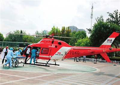 昨天上午,天津市人民醫(yī)院急診大樓門前,上演了一幕真實(shí)版的直升機(jī)救援“大片”。上午10點(diǎn)17分,一架印有PICC字樣的橘色直升機(jī)在眾人的驚呼和抓拍中,輕盈地降落在樓前空地上。但見幾名隨機(jī)醫(yī)護(hù)人員迅速從直升機(jī)上轉(zhuǎn)移一副帶有患者的擔(dān)架,正在值班的醫(yī)務(wù)處王一穎大夫等幾位醫(yī)護(hù)人員快步上前接過,一路小跑把患者推送至急診室。此次轉(zhuǎn)院救援服務(wù)是人保財(cái)險(xiǎn)天津市分公司直升機(jī)救援項(xiàng)目啟動(dòng)以來的首例救援行動(dòng),也是天津市第一起直升機(jī)救援案例,標(biāo)志著天津進(jìn)入空中救援新時(shí)代。
