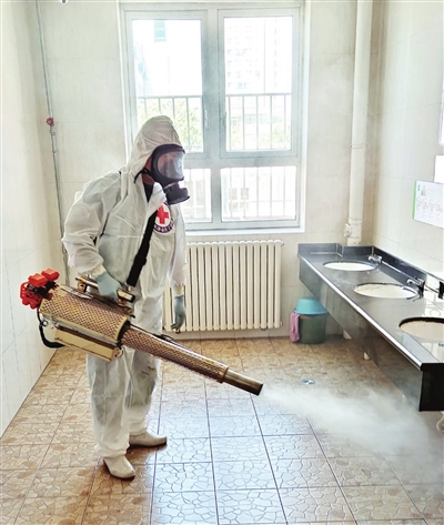 圖為和平區(qū)鞍山道小學(xué)全面進(jìn)行校園消殺工作。