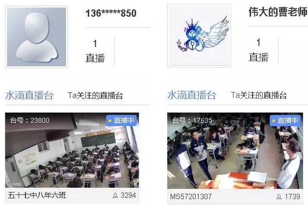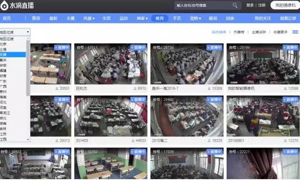 記者在網(wǎng)絡(luò)上搜索“水滴直播”,官網(wǎng)主界面最上面一欄,分為“主播、運(yùn)動(dòng)、寵物、商家、教育”等多個(gè)直播選項(xiàng)。在“教育”一欄頁(yè)面下,依次排列著小窗口,均是學(xué)校教室內(nèi)直播畫面,點(diǎn)開后發(fā)現(xiàn),所處位置有北京、天津、上海、河南等多個(gè)區(qū)域,涉及學(xué)校包括高中、小學(xué)、幼兒園等,有注明具體的學(xué)校名稱和班級(jí),也有以“我的智能攝像機(jī)”的名字代替。