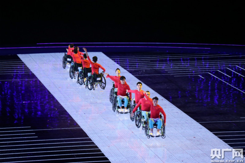 開幕式于當(dāng)晚20時正式開始。在護(hù)旗手的護(hù)衛(wèi)下,中華人民共和國國旗、殘運(yùn)會會旗、特奧會會旗分別入場。隨后裁判員代表方隊(duì)和35個代表團(tuán)的殘疾人運(yùn)動員代表依次入場。
