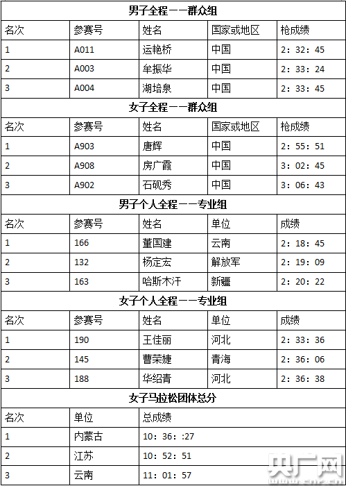 29日上午,第十三屆全運(yùn)會(huì)馬拉松比賽在武清鳴槍開跑,值得注意的是,本屆全運(yùn)會(huì)首次增設(shè)群眾組馬拉松,進(jìn)入前三,男女馬拉松全程群眾組選手均可獲得金銀銅牌的獎(jiǎng)勵(lì)。經(jīng)過近三個(gè)小時(shí)的角逐,來自山東省淄博市的運(yùn)艷橋以兩小時(shí)三十二分四十五秒的成績(jī)奪得男子全程群眾組的冠軍,唐輝則以兩小時(shí)五十五分五十一秒的成績(jī)摘得女子全程群眾組的金牌。此外,董國建、王佳麗分別摘得專業(yè)組男子、女子全程個(gè)人冠軍。內(nèi)蒙古隊(duì)收獲女子馬拉松團(tuán)體總分第一名的成績(jī),將女子團(tuán)體金牌收入囊中。