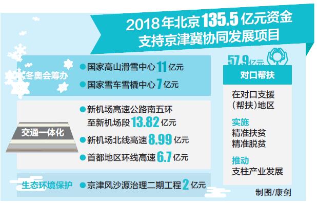 建設(shè)京張城際鐵路、首都地區(qū)環(huán)線高速,治理京津風沙源、綠化太行山……記者昨日從北京市財政局獲悉,2018年,北京將向京津冀協(xié)同發(fā)展項目注入資金135.5億元。