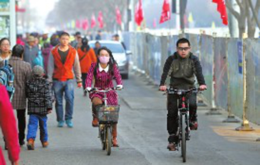 7日9時(shí)03分,在阿勒泰路,由于道路圍蔽施工,有市民選擇騎自行車出行。