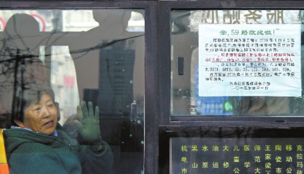 7日9時(shí)27分,在阿勒泰路、新醫(yī)路交會(huì)路口,一位老人乘上臨時(shí)改線的59路公交車后,向家人揮手。