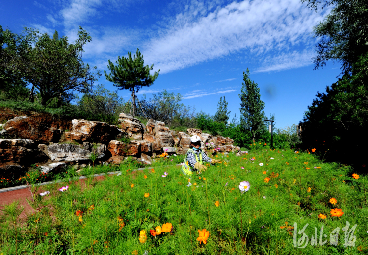 近日,河北省淶源縣煙墩山公園工作人員管護(hù)道路邊花卉。