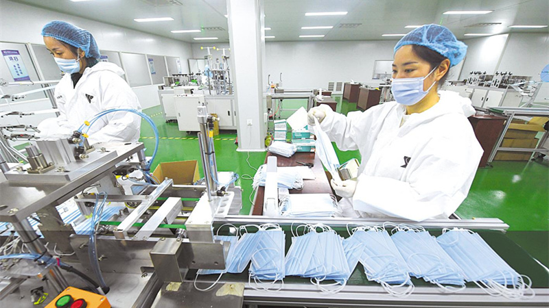 位于湖北省十堰張灣區(qū)的湖北基成防護(hù)用品有限公司員工在生產(chǎn)線上忙碌,這里日產(chǎn)口罩50萬只。