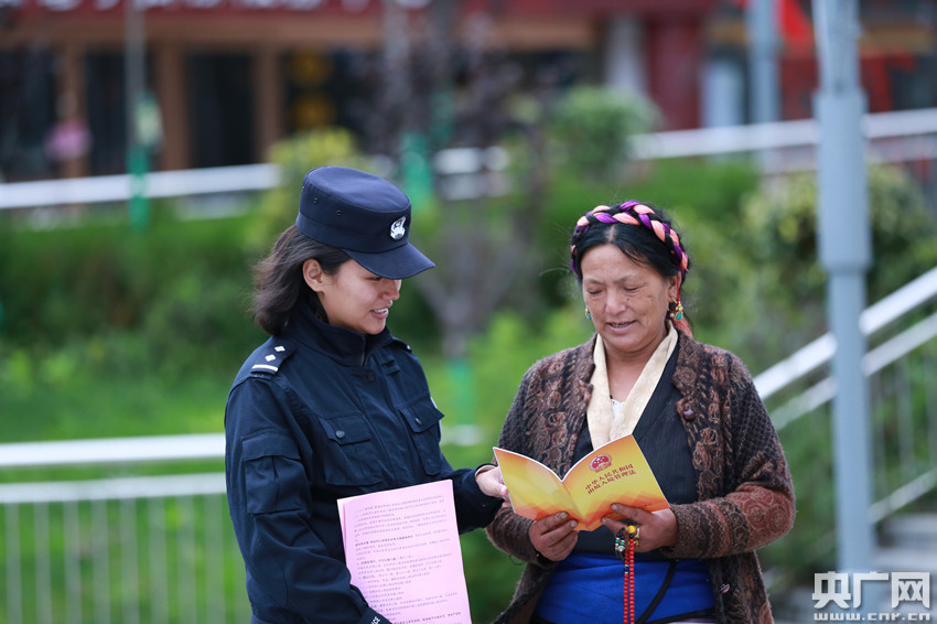 民警旦增白吉為駐地群眾講解《中華人民共和國出入境管理法》(央廣網(wǎng)發(fā) 肖富貴 攝)