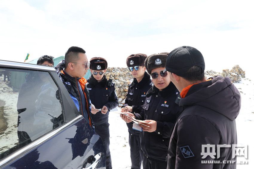 索朗達(dá)杰(右二)帶領(lǐng)民警對進(jìn)入轄區(qū)車輛和人員進(jìn)行檢查。(央廣網(wǎng)發(fā) 通訊員供圖)