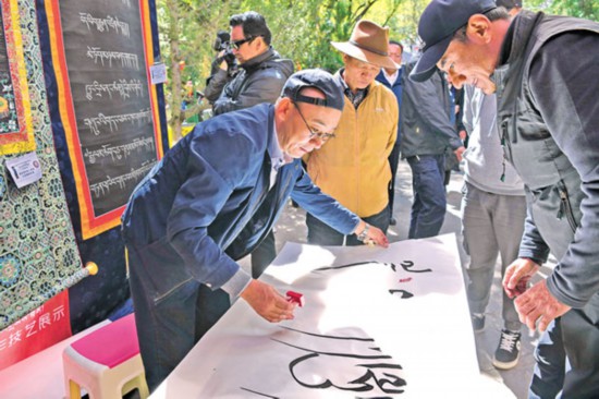 國慶期間,拉薩市宗角祿康公園、羅布林卡公園、南山公園、曲米路濕地公園舉行了文藝演出、特色產(chǎn)品展銷、書法展示、藏戲表演等一系列活動。圖為拉薩市書法家和書法愛好者在羅布林卡內(nèi)為過往市民獻(xiàn)上書法作品。記者唐斌 次旺 攝