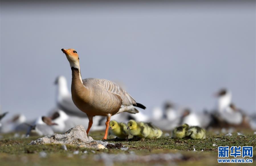 6月9日拍攝的西藏安多縣境內(nèi)嘎龍湖鳥島上的斑頭雁。新華社記者 覺果 攝