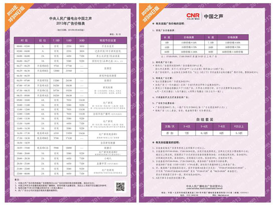 中央人民廣播電臺(tái)中國(guó)之聲、經(jīng)濟(jì)之聲廣告價(jià)格將于2013年3月28日起調(diào)整,調(diào)整后價(jià)格表已于日前正式發(fā)布。全權(quán)負(fù)責(zé)中國(guó)之聲、經(jīng)濟(jì)之聲廣告業(yè)務(wù)經(jīng)營(yíng)的央廣廣告公司授權(quán)本網(wǎng)站獨(dú)家刊載,未經(jīng)授權(quán)請(qǐng)勿擅自刊登或轉(zhuǎn)載,否則將追究相關(guān)法律責(zé)任。