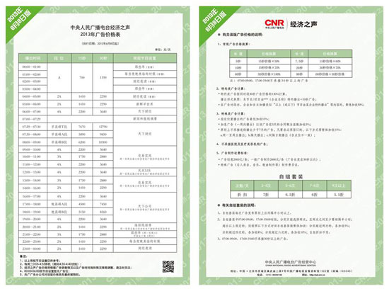 中央人民廣播電臺(tái)中國(guó)之聲、經(jīng)濟(jì)之聲廣告價(jià)格將于2013年6月8日起調(diào)整,調(diào)整后價(jià)格表已于日前正式發(fā)布。全權(quán)負(fù)責(zé)中國(guó)之聲、經(jīng)濟(jì)之聲廣告業(yè)務(wù)經(jīng)營(yíng)的央廣廣告公司授權(quán)本網(wǎng)站獨(dú)家刊載,未經(jīng)授權(quán)請(qǐng)勿擅自刊登或轉(zhuǎn)載,否則將追究相關(guān)法律責(zé)任。