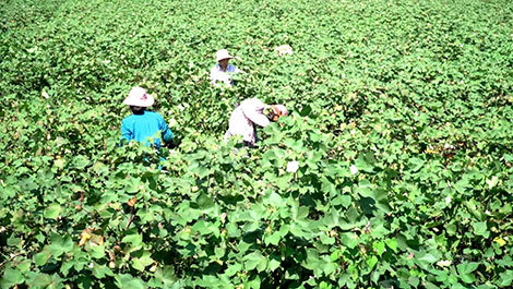 在江西九江市彭澤縣東升鎮(zhèn)桃紅村,村民在棉田里采摘棉花,呈現(xiàn)一片豐收景象。