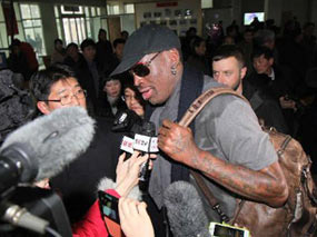 2月26日,美國(guó)NBA退役球員羅德曼(中)在抵達(dá)平壤順安機(jī)場(chǎng)后接受記者采訪。當(dāng)日,一個(gè)由美國(guó)全國(guó)籃球協(xié)會(huì)(NBA)教練和球員組成的代表團(tuán)抵達(dá)平壤,開(kāi)始對(duì)朝鮮進(jìn)行為期一周的訪問(wèn)。