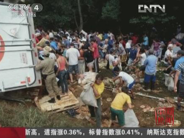 巴西一卡車途中翻車 30噸雞肉遭哄搶