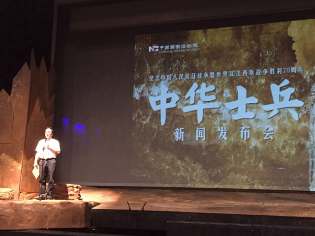 為紀念中國人民抗日戰(zhàn)爭暨世界反法西斯戰(zhàn)爭勝利70周年,中國國家話劇院出品及演出,馮俐編劇、查明哲導演的原創(chuàng)大戲《中華士兵》經(jīng)過前后近三年的籌備、文本八易其稿,近兩個月艱苦排練,前后多日舞臺機械和多媒體聲光合成,日前在中央戲劇學院實驗劇場進行內(nèi)部試演。48名演員在兩個半小時的時間內(nèi)恢弘地全景再現(xiàn)了中國人民抗日戰(zhàn)爭時期全民抗戰(zhàn)的英雄史詩,塑造出中國人高貴的英雄群像!吨腥A士兵》區(qū)別了以往藝術作品對于抗戰(zhàn)的表現(xiàn),立視角之新、拓格局之寬、描細節(jié)之深、塑人物之豐,可謂空前。