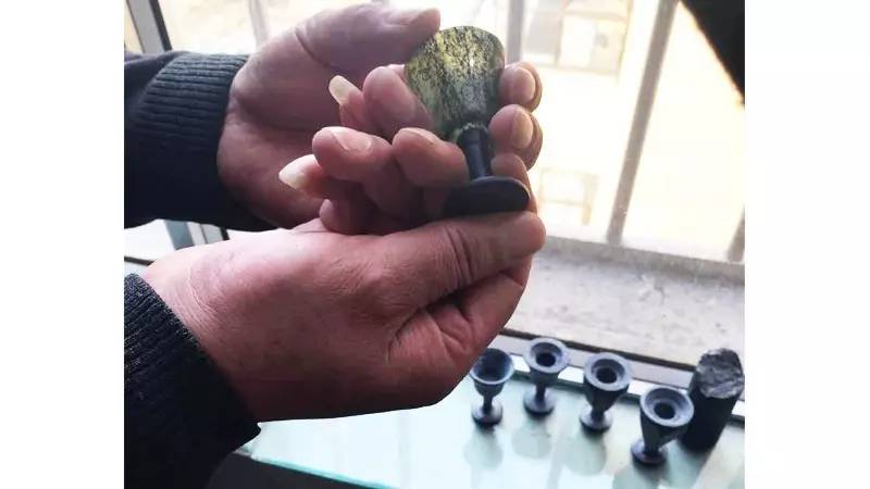 權(quán)玉廷展示不同階段夜光杯半成品