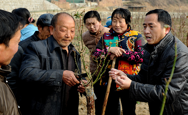 1月6日,園藝專業(yè)畢業(yè)的佛坪縣委組織部副部長田間(右一)在西岔河鎮(zhèn)銀廠溝村苗木基地與群眾一起交流嫁接玫瑰修剪管護技術(shù)。全縣部門包聯(lián)、特聘專家教授、農(nóng)業(yè)實用人才、致富能手,組建講師團、服務(wù)隊幫助群眾學(xué)技術(shù),年培訓(xùn)近百場次。
