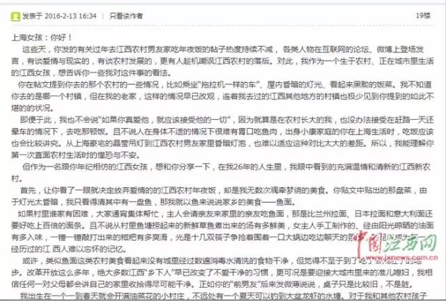 2月13日,一名自稱是在江西農(nóng)村長(zhǎng)大的網(wǎng)友“爾雅2016”在中國(guó)江西網(wǎng)(江西手機(jī)報(bào))的“大江論壇”發(fā)帖,給這位上海女孩寫了一封信,講述了她眼中充滿溫情和清新的江西農(nóng)村。