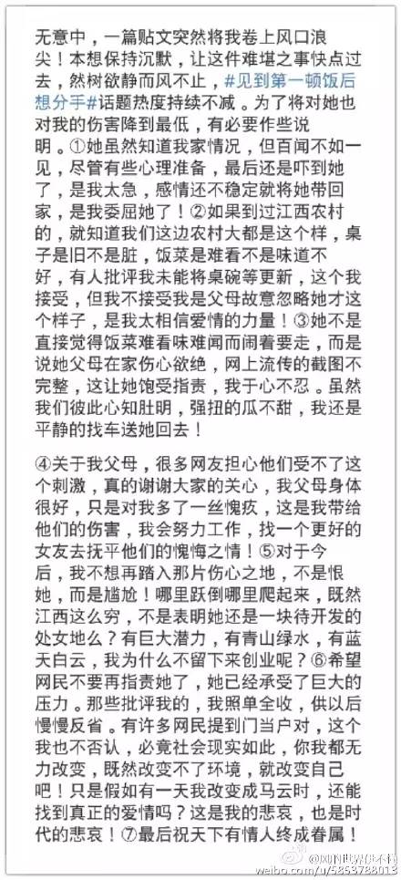 面對(duì)網(wǎng)上的眾說紛紜,2月10日,事件中的江西男友終于在微博上發(fā)表聲明,表示江西“有巨大潛力,有青山綠水,有藍(lán)天白云,我為什么不留下來創(chuàng)業(yè)呢”。這位江西小伙決定“改變自己”,留在家鄉(xiāng)創(chuàng)業(yè)的做法得到了許多網(wǎng)友的點(diǎn)贊。