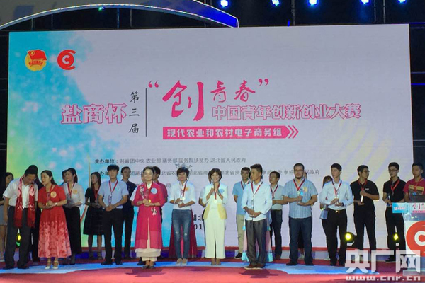 央廣網(wǎng)北京9月7日消息(記者何鵬)據(jù)中國(guó)鄉(xiāng)村之聲報(bào)道,9月7日上午,“鹽商杯”第三屆“創(chuàng)青春”中國(guó)青年創(chuàng)新創(chuàng)業(yè)大賽(現(xiàn)代農(nóng)業(yè)和農(nóng)村電子商務(wù)組)全國(guó)賽在湖北省孝感市閉幕。團(tuán)中央書(shū)記處書(shū)記徐曉觀摩決賽并為獲獎(jiǎng)選手頒獎(jiǎng)。農(nóng)業(yè)部、商務(wù)部、國(guó)務(wù)院扶貧辦、湖北省人民政府等主辦單位相關(guān)負(fù)責(zé)同志,冠名贊助單位及各承辦單位、支持單位代表出席活動(dòng)。20余家創(chuàng)業(yè)投資機(jī)構(gòu)負(fù)責(zé)人、入圍決賽的30強(qiáng)參賽項(xiàng)目負(fù)責(zé)人及創(chuàng)業(yè)青年代表等1500余人,參加全國(guó)賽決賽暨頒獎(jiǎng)儀式。