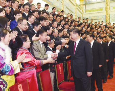 上午9時30分,習(xí)近平等來到人民大會堂金色大廳,同代表們親切握手,并合影留念。