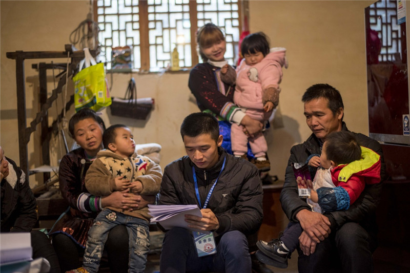 1月2日,在貴州省從江縣往洞村,農(nóng)業(yè)普查員楊遠(yuǎn)紅(中)在農(nóng)戶家采集數(shù)據(jù)。