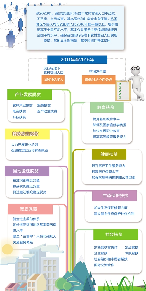 國家發(fā)改委地區(qū)司有關(guān)負(fù)責(zé)人介紹,《規(guī)劃》按照精準(zhǔn)扶貧精準(zhǔn)脫貧基本方略要求,因地制宜,分類施策,從8個(gè)方面實(shí)化細(xì)化了相關(guān)路徑和措施:一是產(chǎn)業(yè)發(fā)展脫貧,主要包括農(nóng)林產(chǎn)業(yè)扶貧、旅游扶貧、電商扶貧、科技扶貧等方面,提出了13項(xiàng)產(chǎn)業(yè)扶貧工程或具體措施;二是轉(zhuǎn)移就業(yè)脫貧,主要從組織開展職業(yè)培訓(xùn)和促進(jìn)轉(zhuǎn)移就業(yè)等方面,提出了6項(xiàng)就業(yè)扶貧行動(dòng);三是易地搬遷脫貧,對(duì)“一方水土養(yǎng)不起一方人”地區(qū)建檔立卡貧困人口實(shí)施易地扶貧搬遷,實(shí)現(xiàn)搬得出、穩(wěn)得住、能脫貧;四是教育扶貧,主要從基礎(chǔ)教育、職業(yè)教育和降低貧困家庭就學(xué)負(fù)擔(dān)等方面,提出了一系列行動(dòng)計(jì)劃和措施,不斷提升貧困人口綜合素質(zhì)和就業(yè)技能,逐步消除因?qū)W致貧問題,阻斷貧困代際傳遞;五是健康扶貧,主要從醫(yī)療衛(wèi)生服務(wù)、醫(yī)療保障、疾病防控和公共衛(wèi)生等方面,提出了6大健康扶貧工程,加快推進(jìn)基本公共衛(wèi)生服務(wù)均等化,有效緩解因病致貧返貧問題;六是生態(tài)保護(hù)扶貧,主要從生態(tài)保護(hù)修復(fù)、生態(tài)保護(hù)補(bǔ)償機(jī)制2個(gè)方面,提出了11項(xiàng)重大生態(tài)扶貧工程和4項(xiàng)生態(tài)保護(hù)補(bǔ)償方式,使貧困群眾通過參與生態(tài)保護(hù)實(shí)現(xiàn)脫貧;七是兜底保障,主要從社會(huì)救助、基本養(yǎng)老保障、農(nóng)村“三留守”人員和殘疾人等方面,提出了社會(huì)保障兜底措施,通過筑牢社會(huì)保障安全網(wǎng),解決好特殊困難群體和弱勢(shì)群體的脫貧問題;八是社會(huì)扶貧,主要從東西部扶貧協(xié)作、定點(diǎn)幫扶、企業(yè)幫扶、軍隊(duì)幫扶、社會(huì)組織和志愿者幫扶,以及國際交流合作等方面,提出了相關(guān)措施和要求。