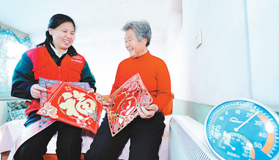 圖為供電公司服務(wù)隊(duì)隊(duì)員來(lái)到李淑英大媽(右)家里了解用電情況。
