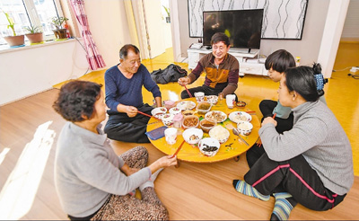 1月24日,吉林省和龍市南坪鎮(zhèn)高嶺村村民白羽榮(左二),正和家人在新房子里吃午飯。當(dāng)?shù)卣喾脚Πl(fā)展養(yǎng)殖業(yè)及木耳種植業(yè)等,同時(shí)還為140戶居民免費(fèi)新建房屋,配合水、電和村路等設(shè)施改造,最終讓高嶺村在2016年摘掉了“貧困帽”。