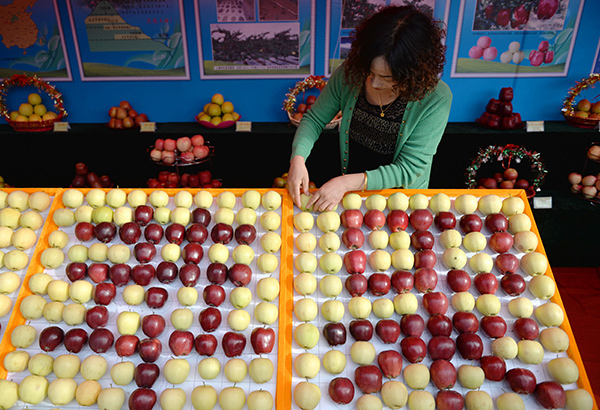 在甘肅省隴南市禮縣蘋果產(chǎn)銷電商洽談對(duì)接會(huì)上,一名工作人員在布置漢字造型的蘋果展臺(tái)(2015年9月25日)。